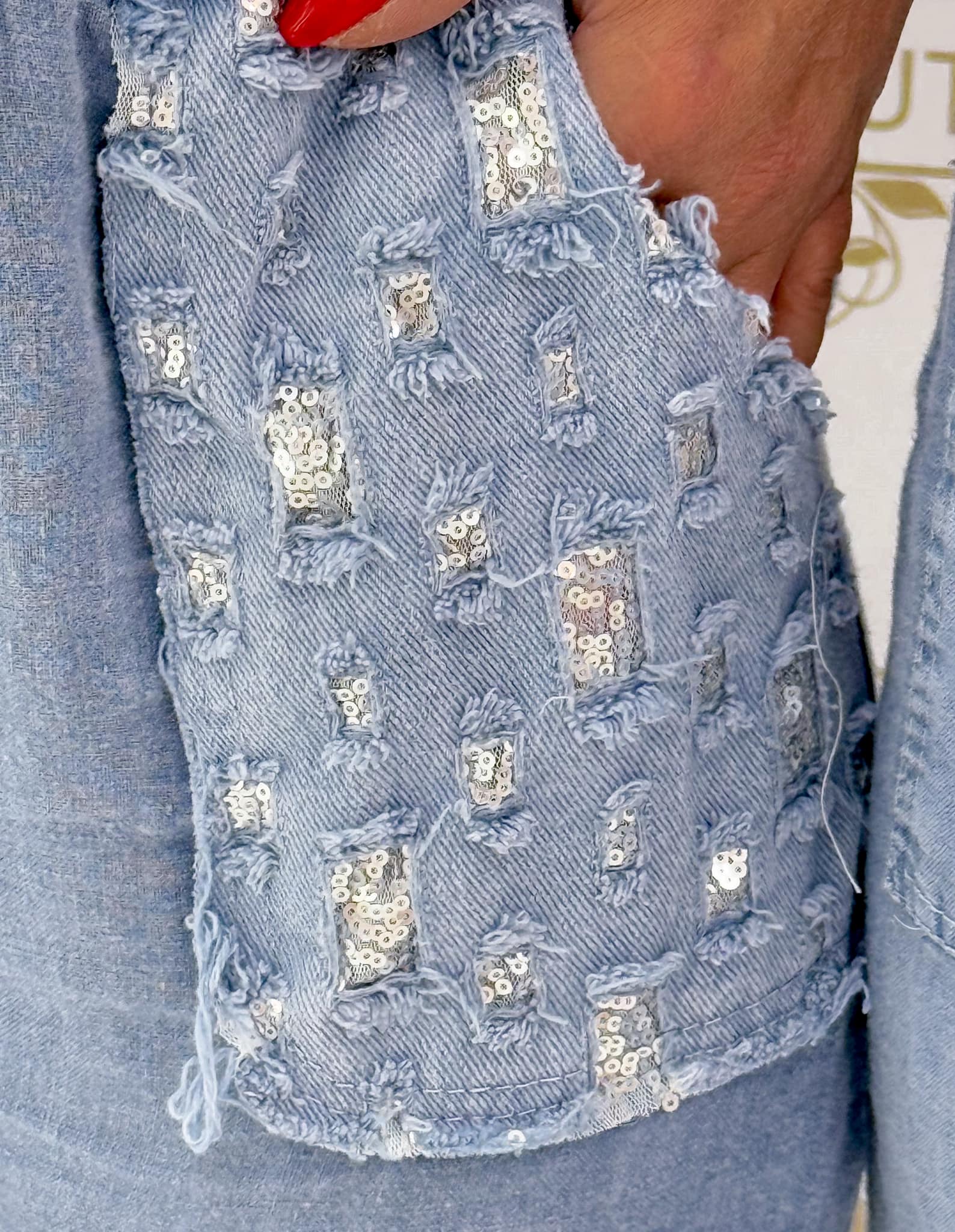 Pants with sequin inserts at the pockets, in a lightweight fabric