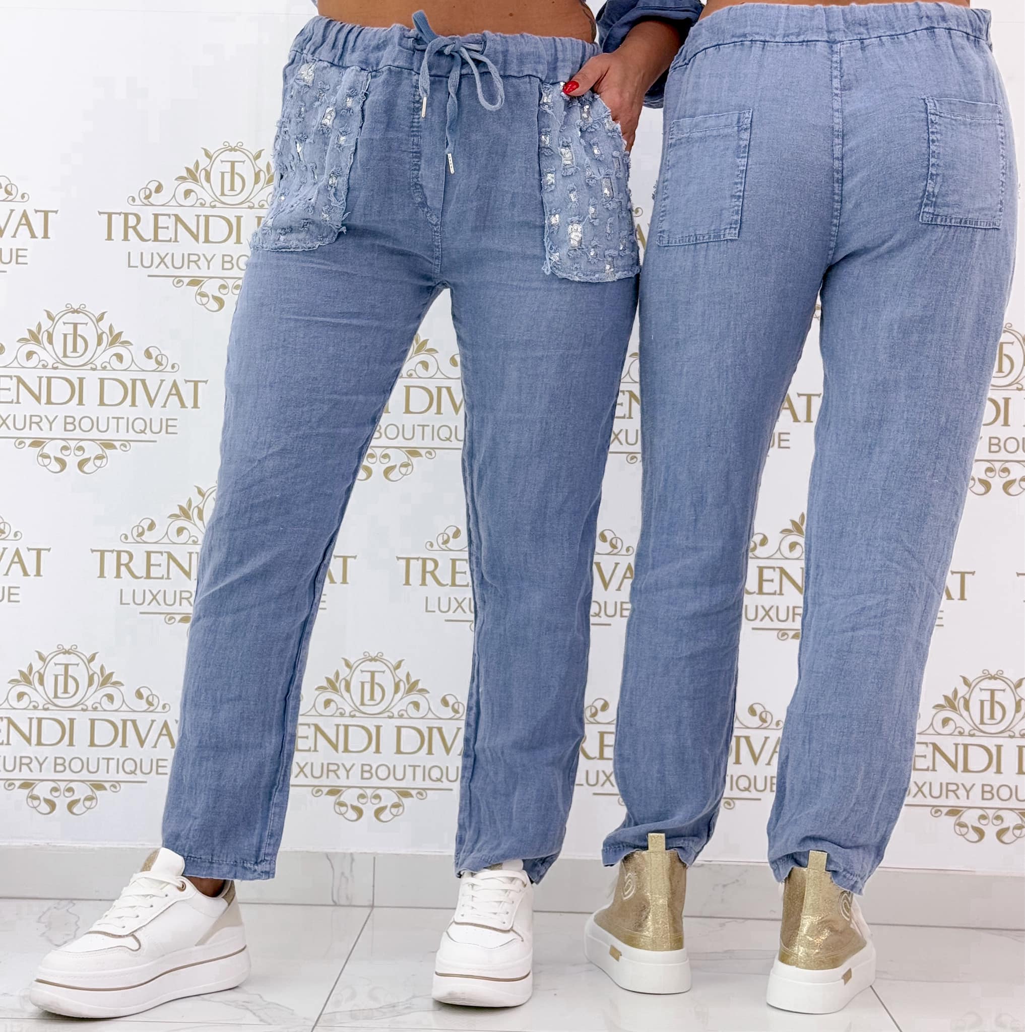 Be the first to review “Pants with sequin inserts at the pockets, in a lightweight fabric”