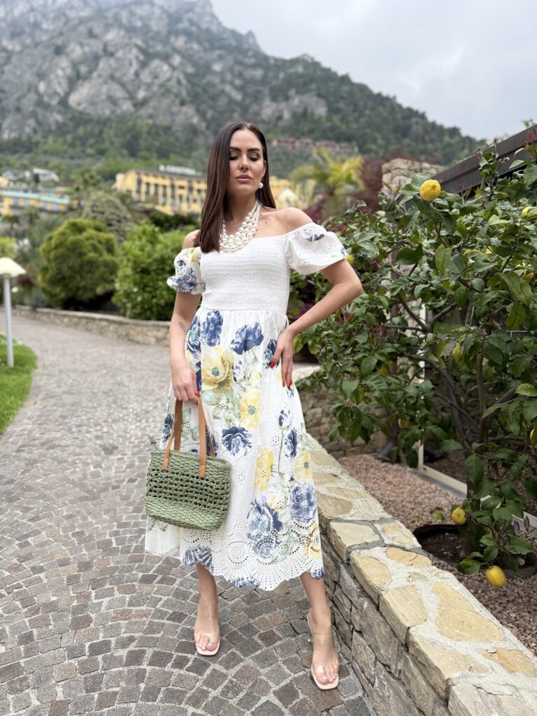 Virág mintázatú, madeira hímzett betétes, lenge anyagú pólóruha