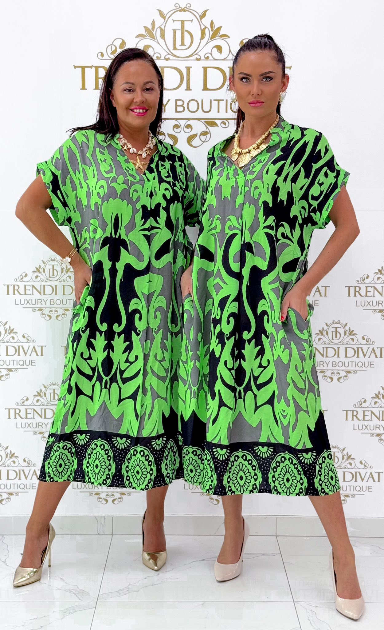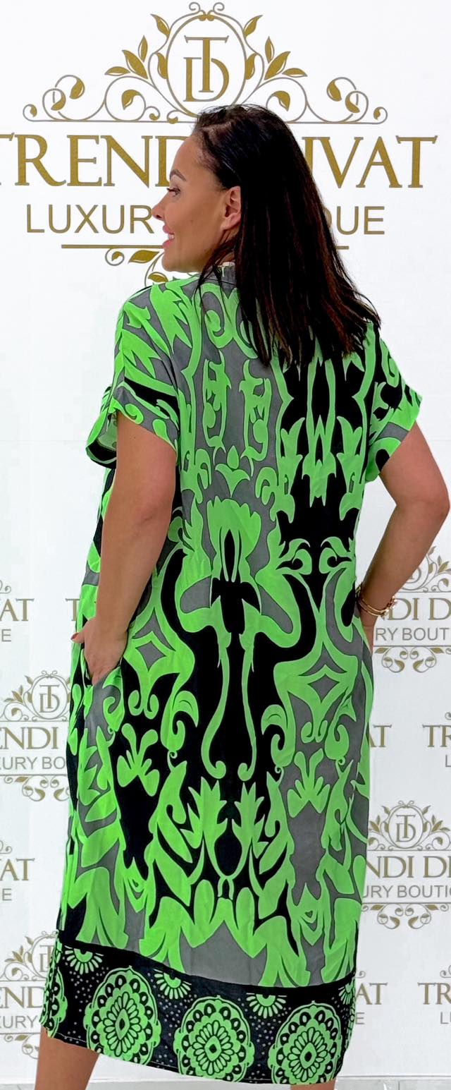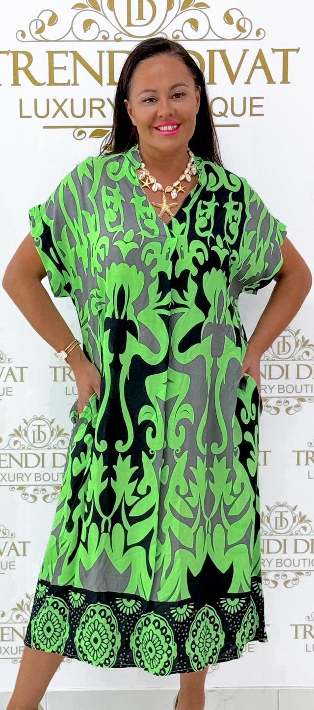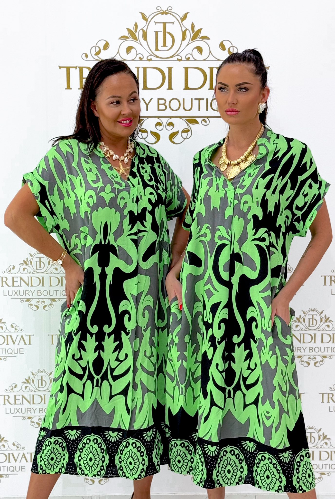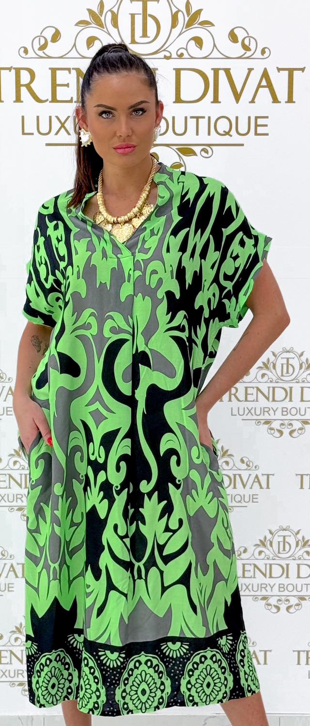 Álló galléros, lenge vászon anyagú, zsebes, mintás maxi tunika