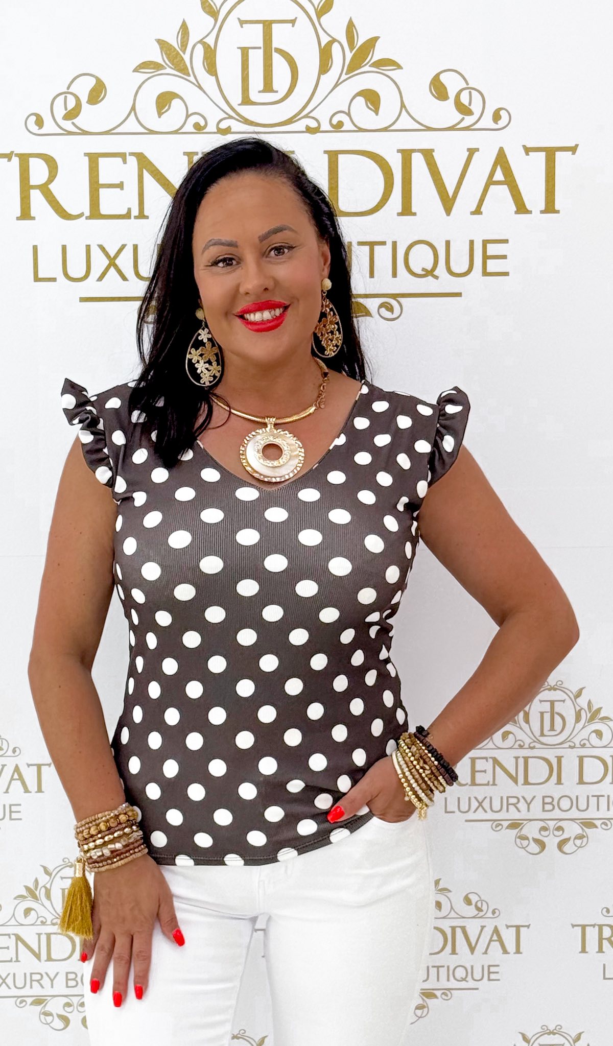 Elől-hátul V-nyakú, fodros vállú, bordázott anyagú, pöttyös kis felső