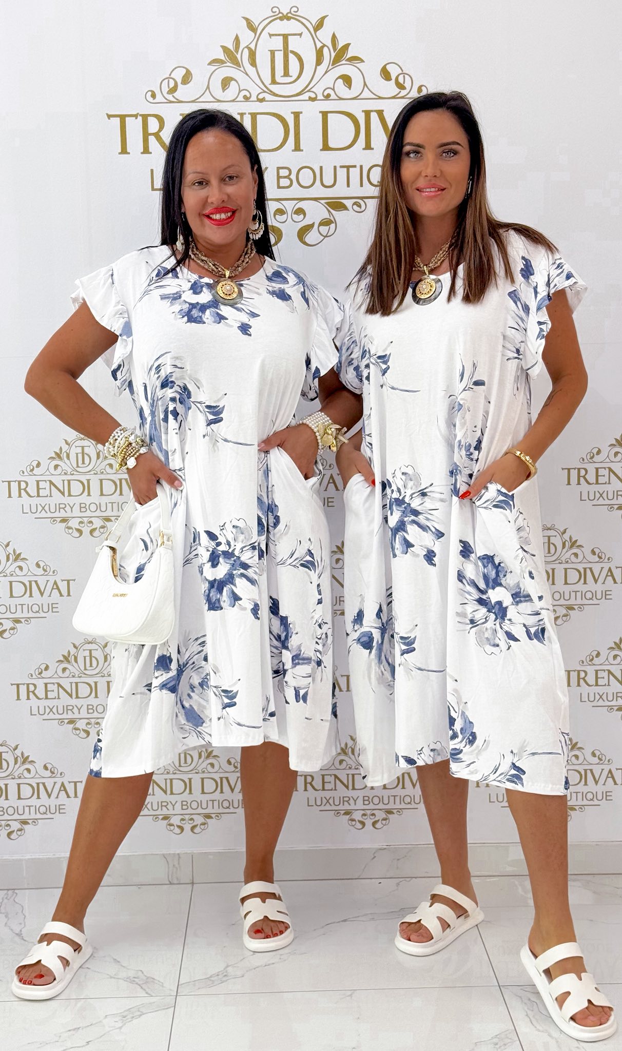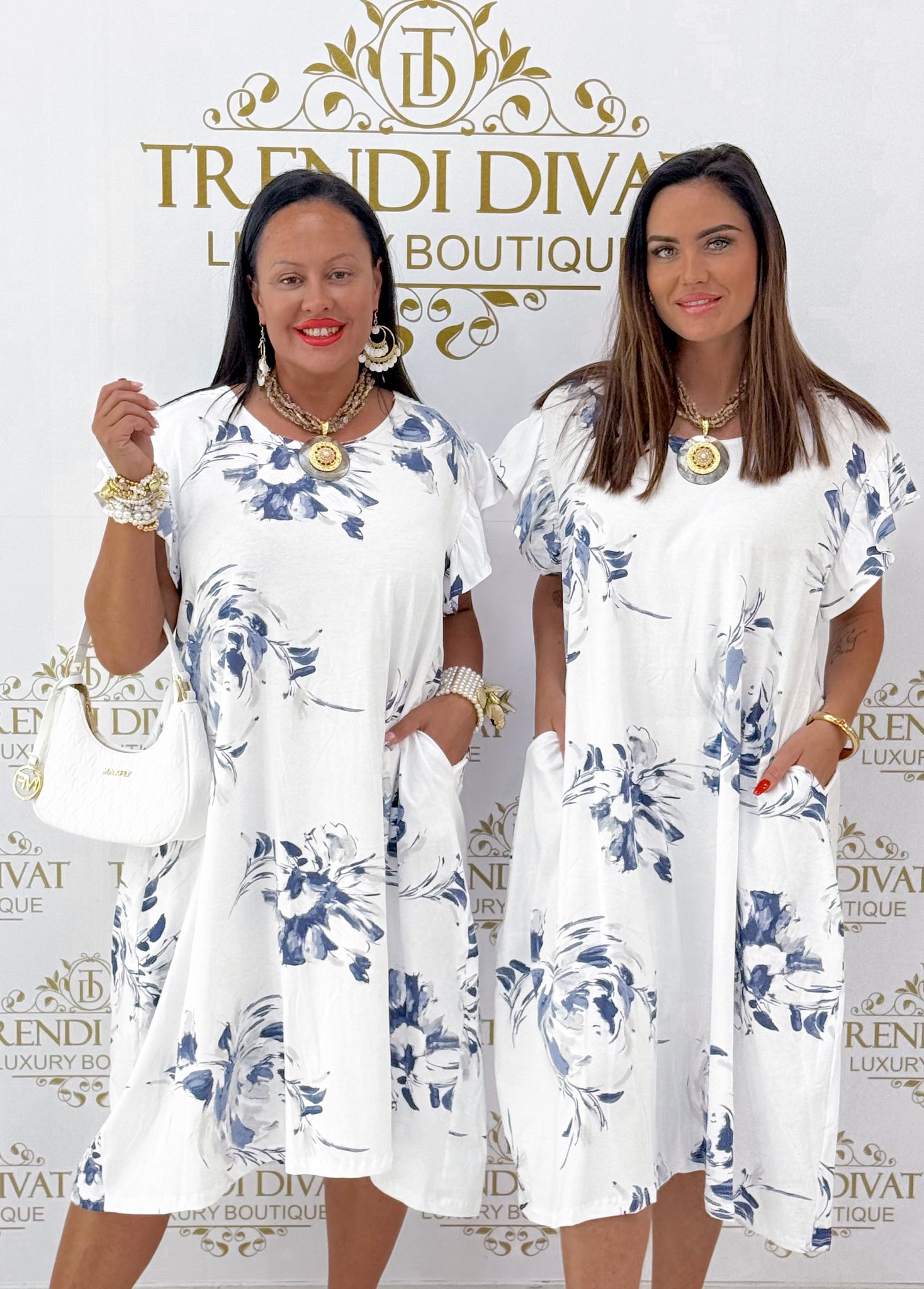 Hátul horgolt betétes, különleges virág mintázatú, lenge anyagú zsebes ruha