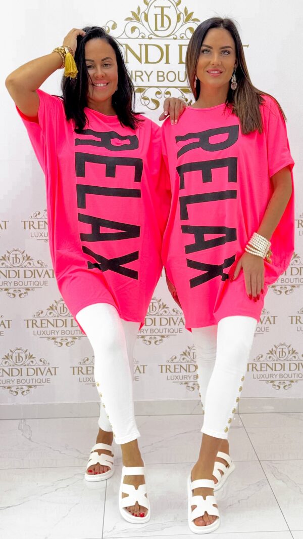 Laza fazonú, elől rövidebb fazonú, “Relax” feliratos tunika