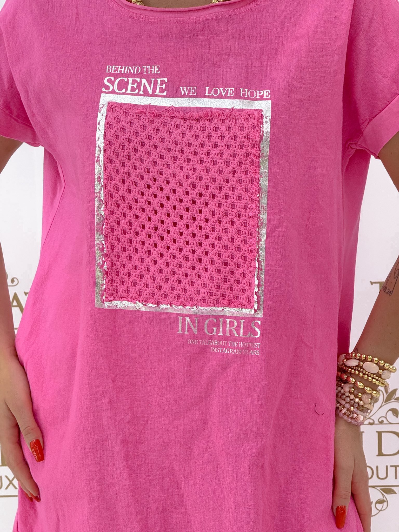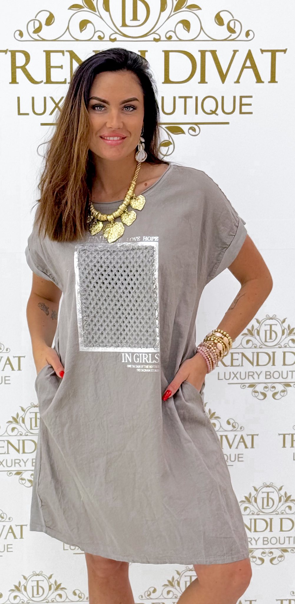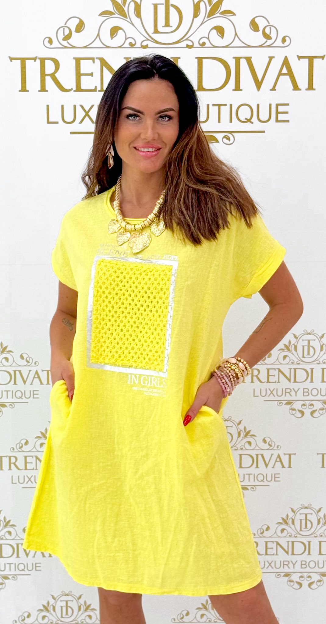 Lenge anyagú, horgolt betétes, zsebes tunika