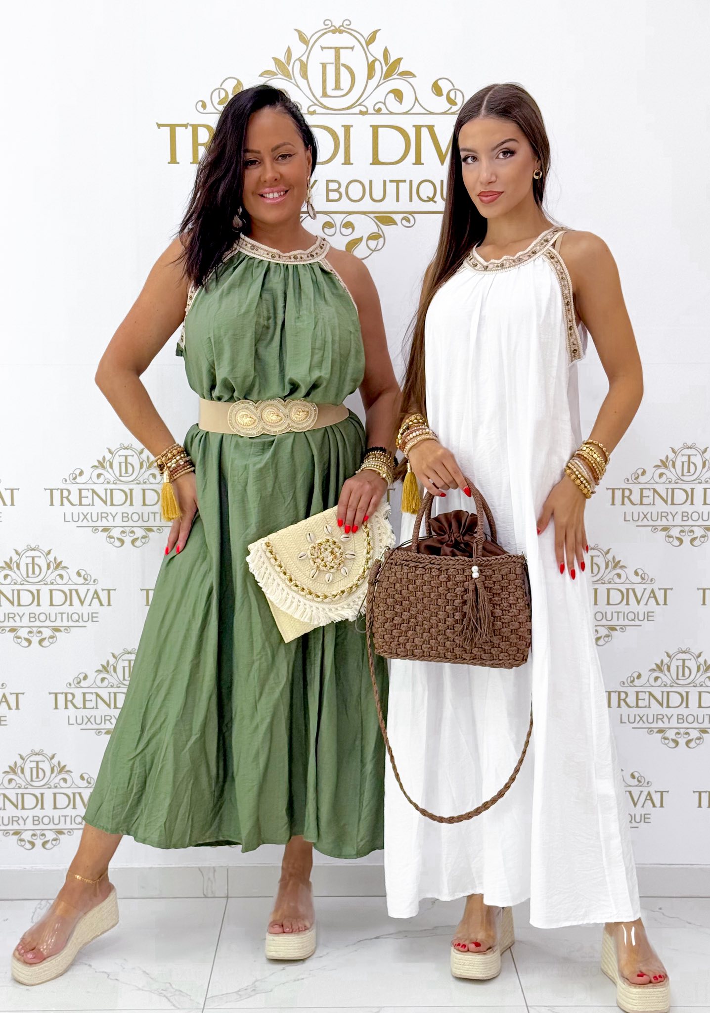 Be the first to review “Nyakánál hímzett, kövekkel díszített, lenvászon hatású maxi ruha”