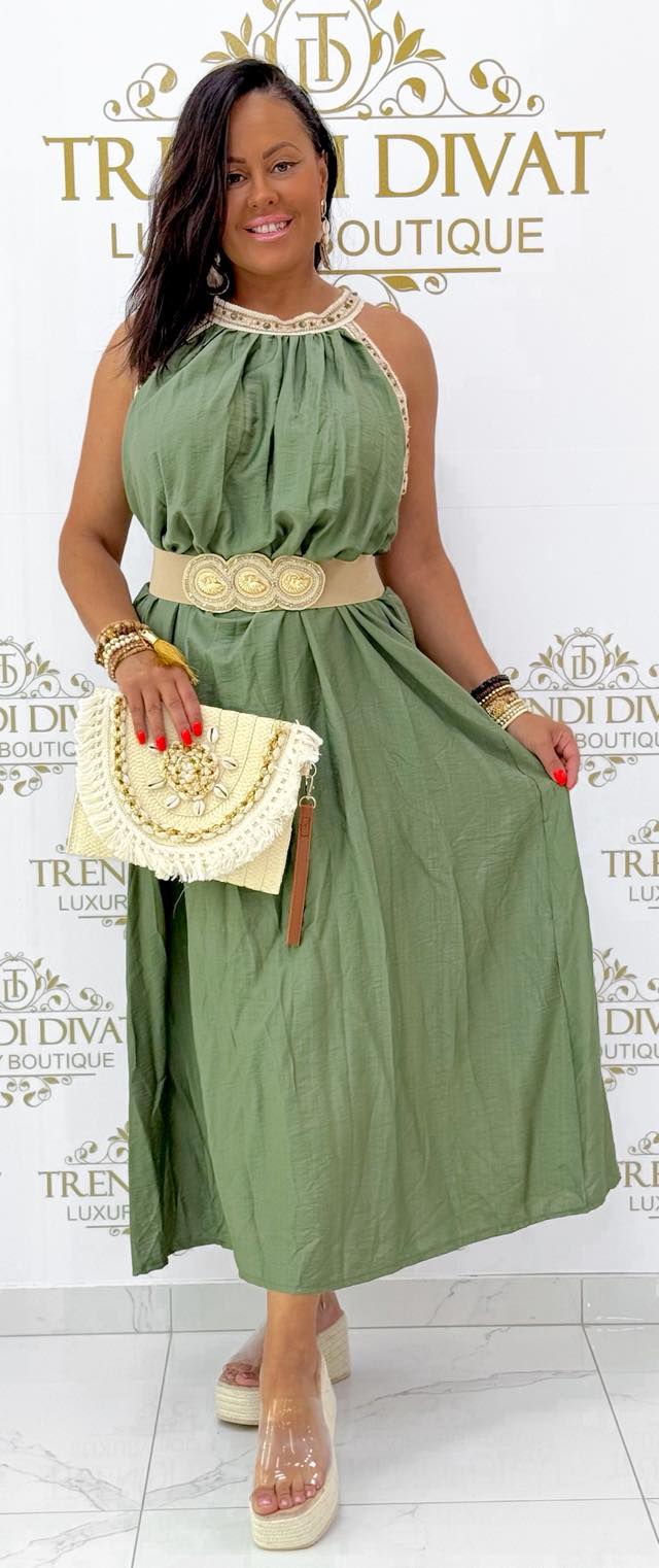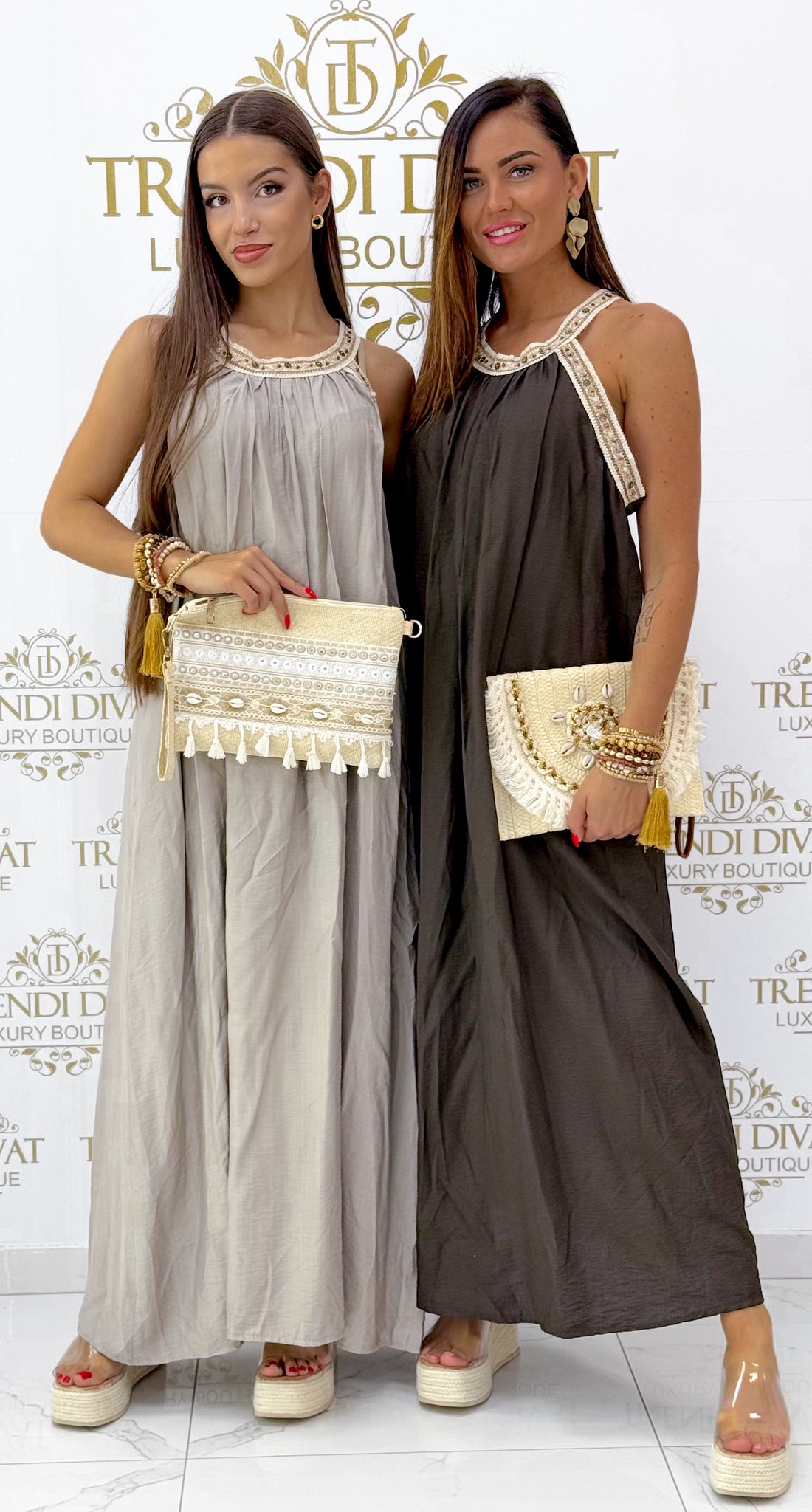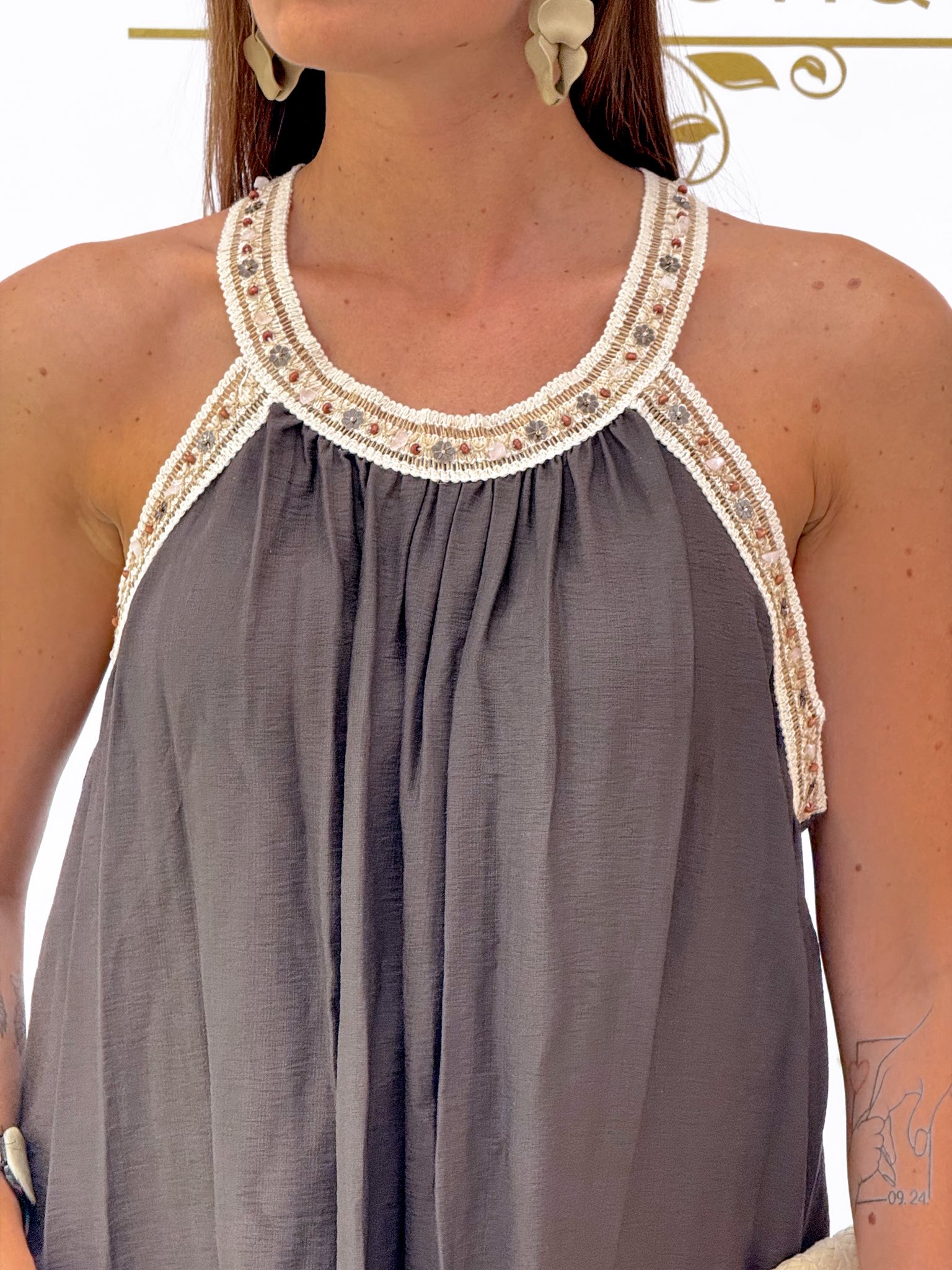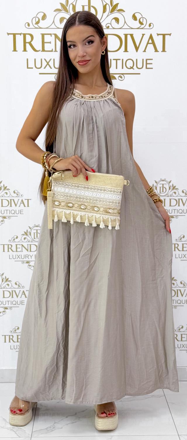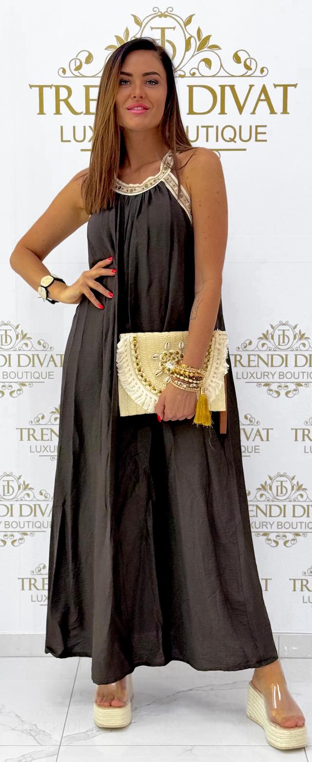 Nyakánál hímzett, kövekkel díszített, lenvászon hatású maxi ruha