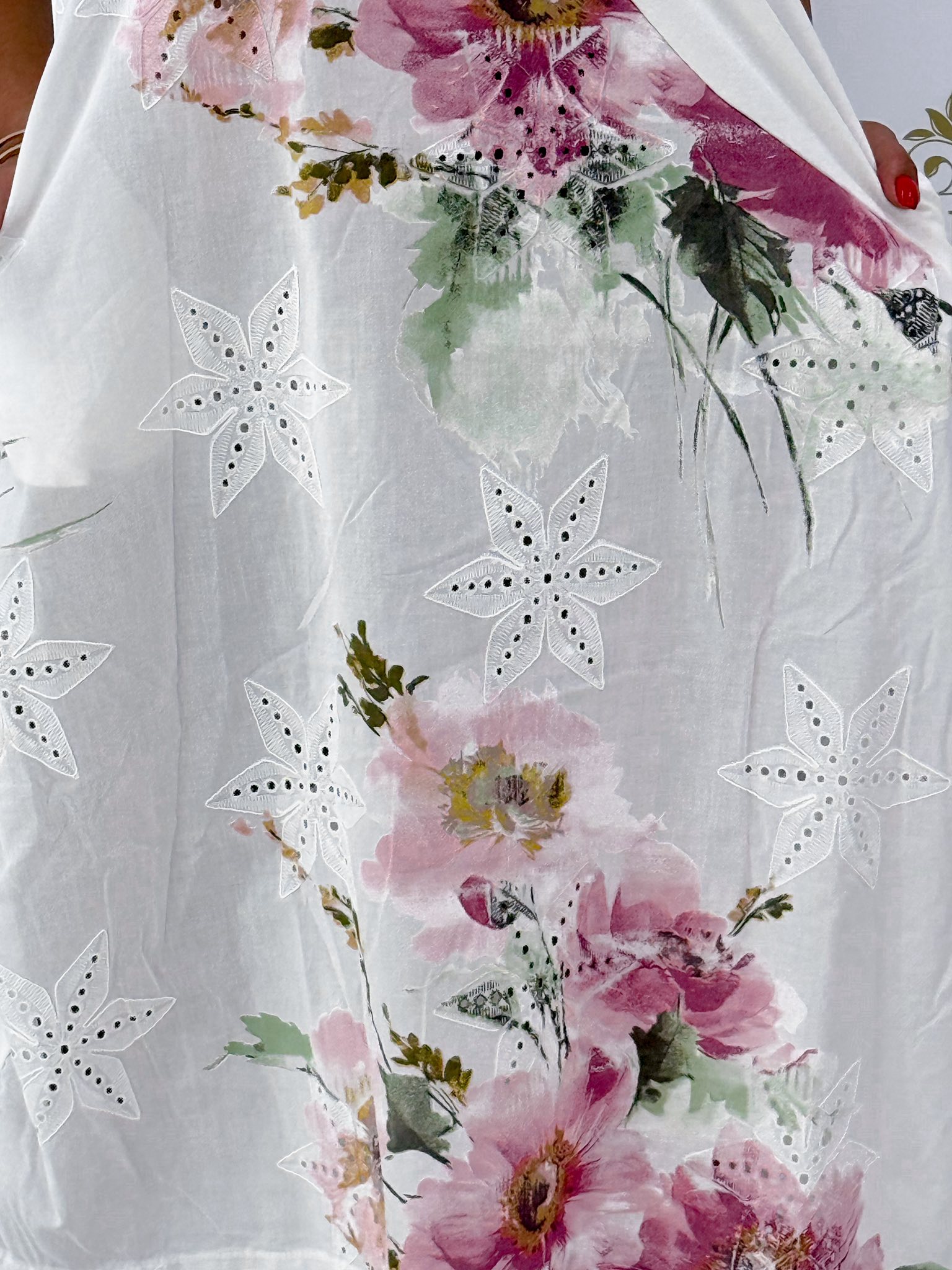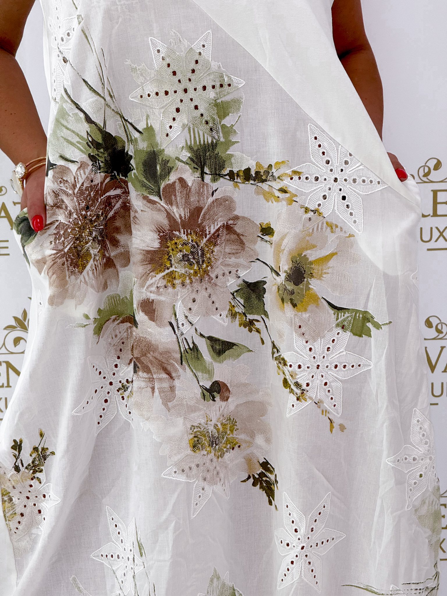 Virág mintázatú, madeira hímzett betétes, lenge anyagú pólóruha