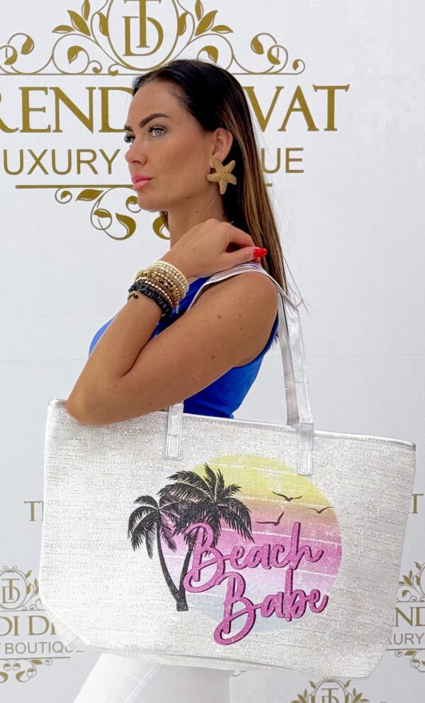 Csillámos, feliratos, pálmafa mintázatú, nagyméretű strandtáska