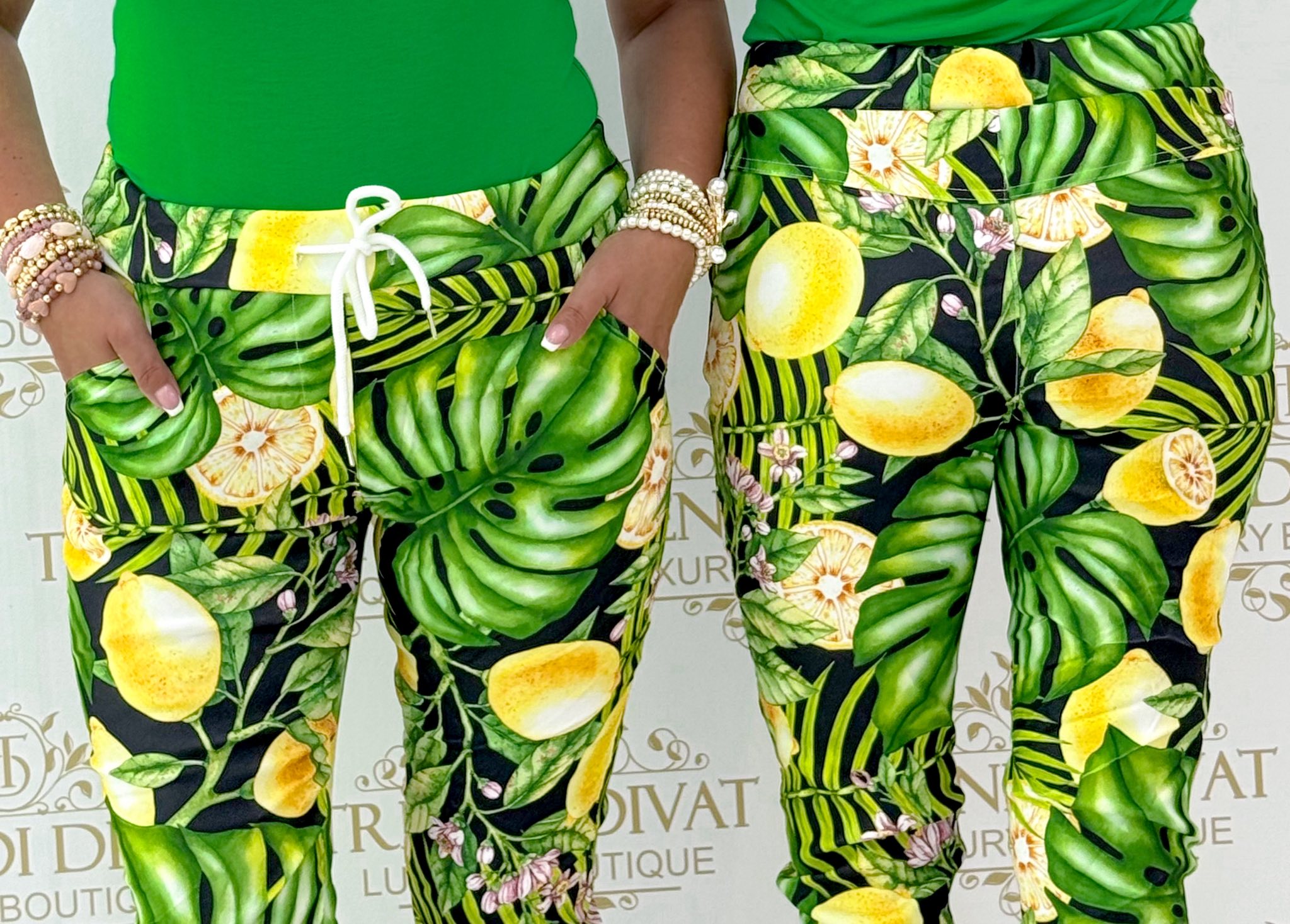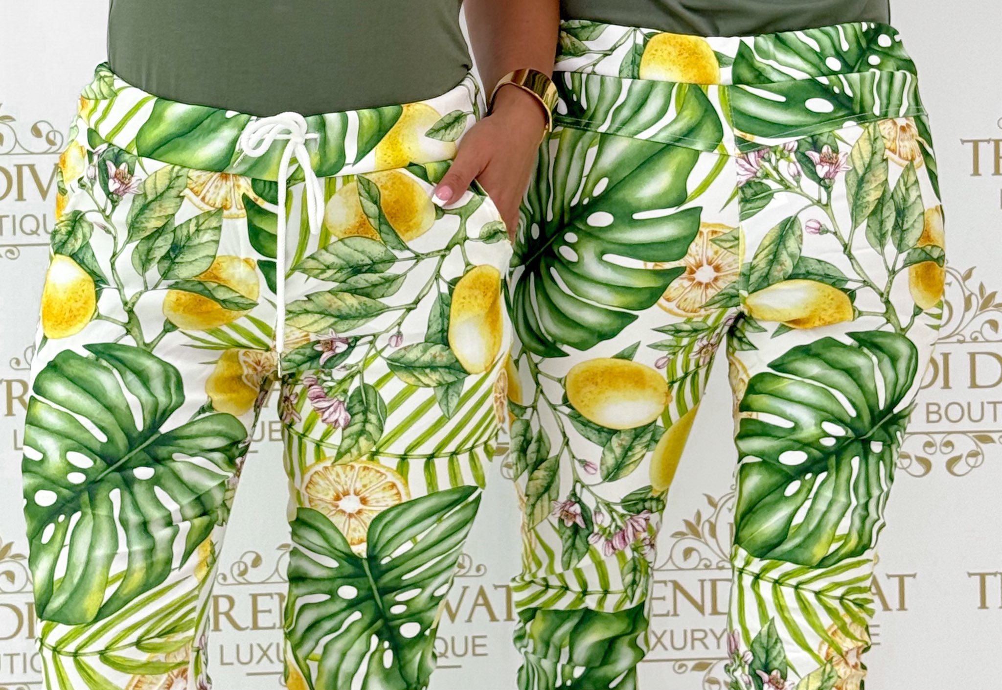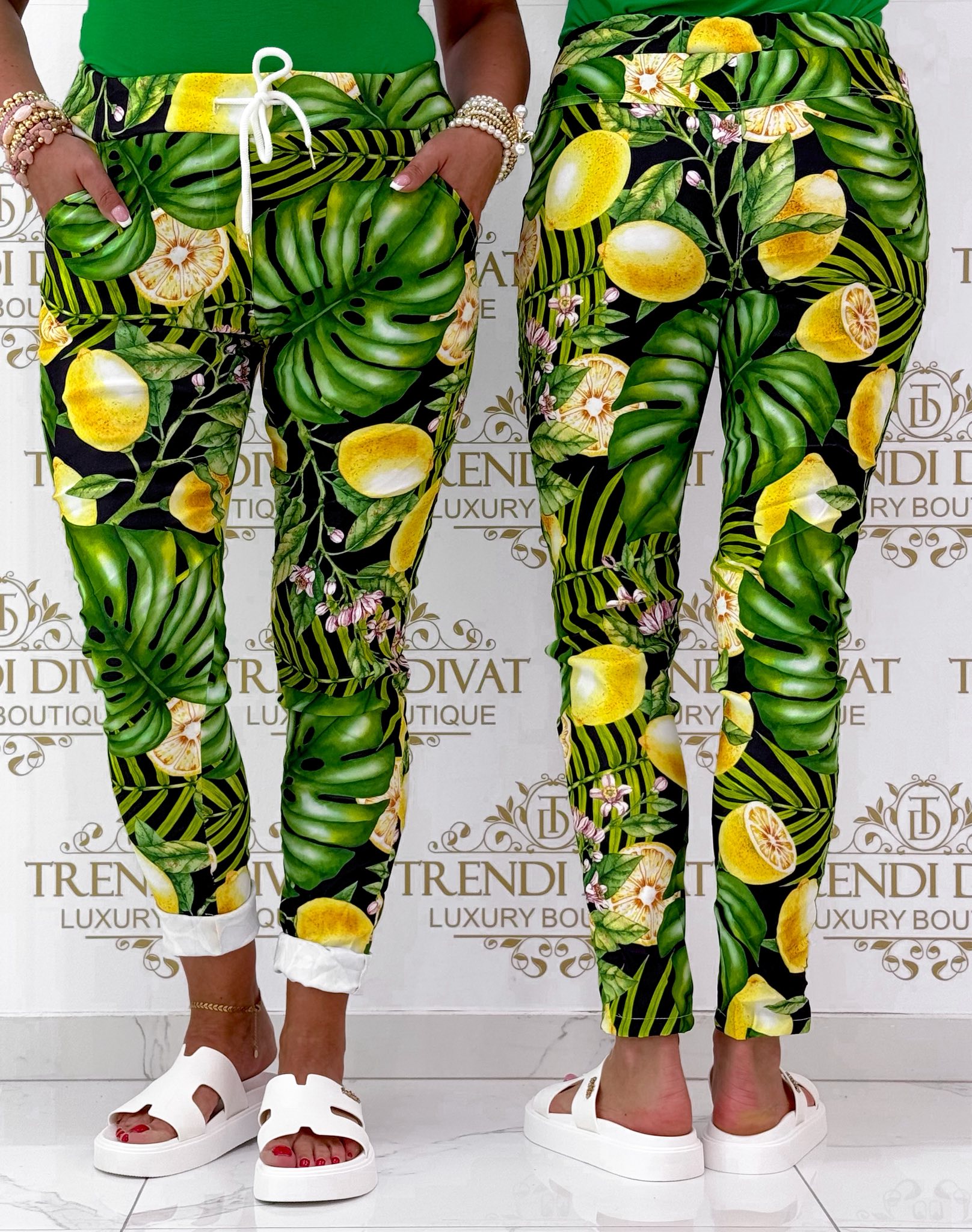 Elasztikus gyűrt vászon anyagú, nagy levél & citrom mintázatú nadrág