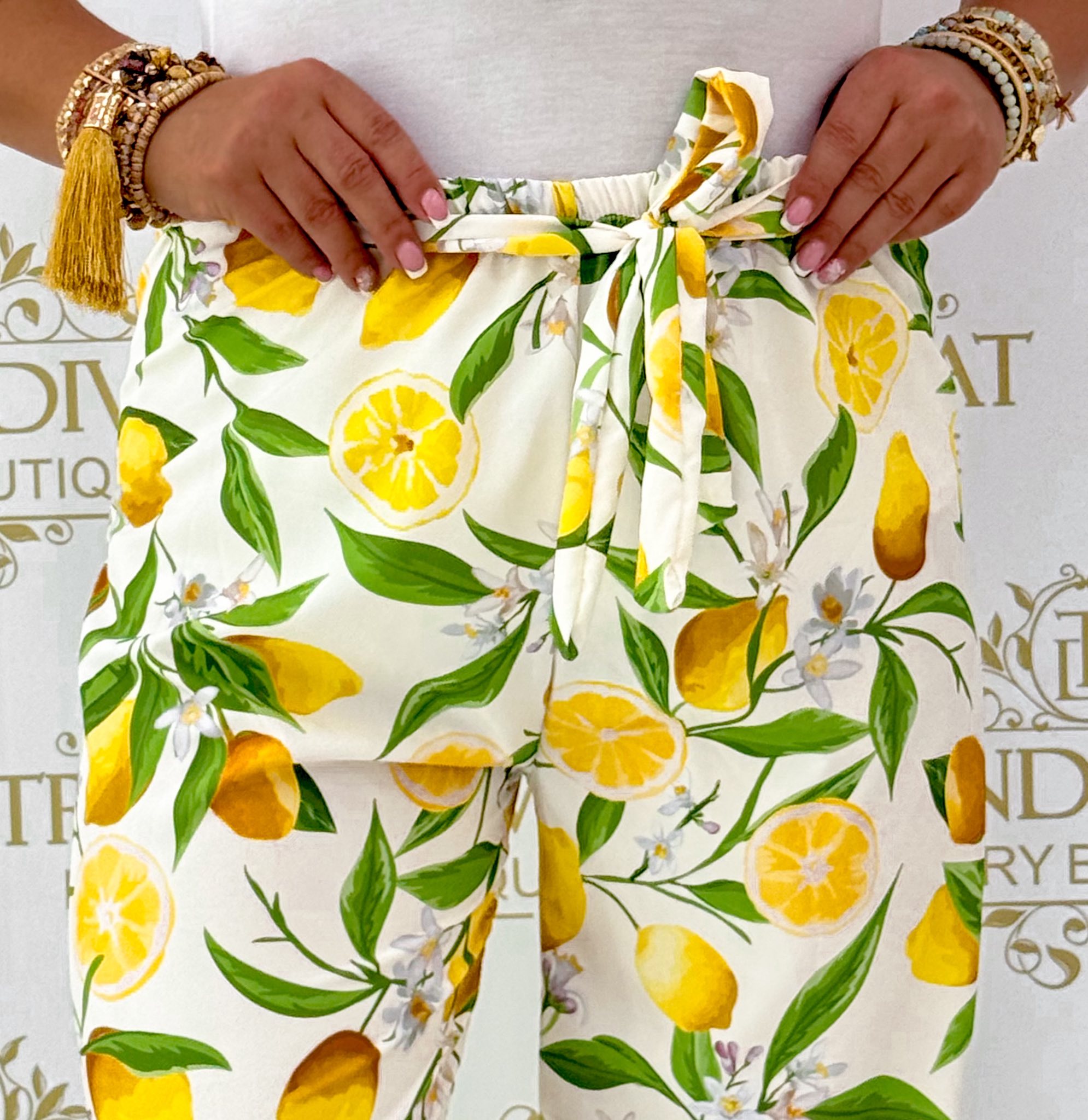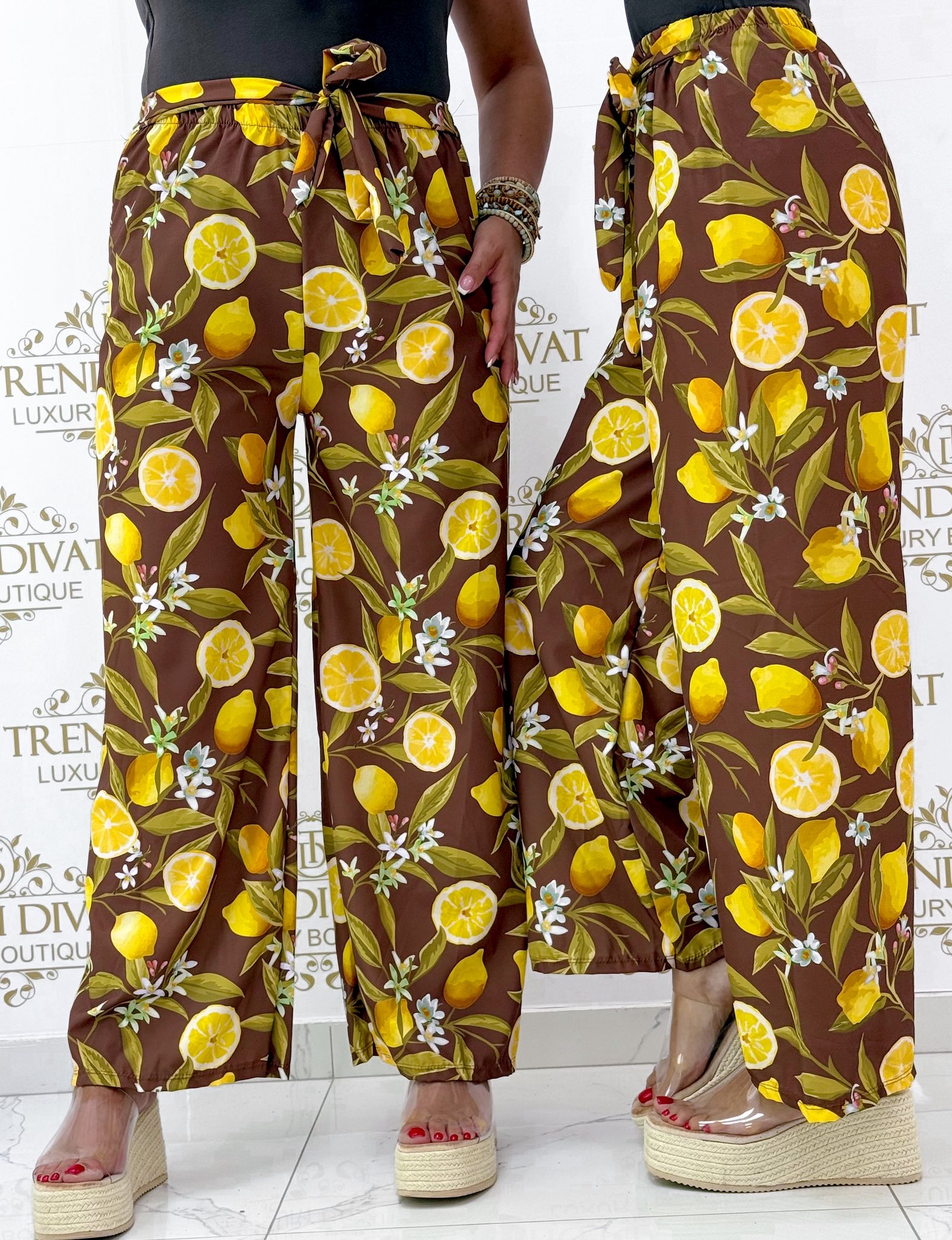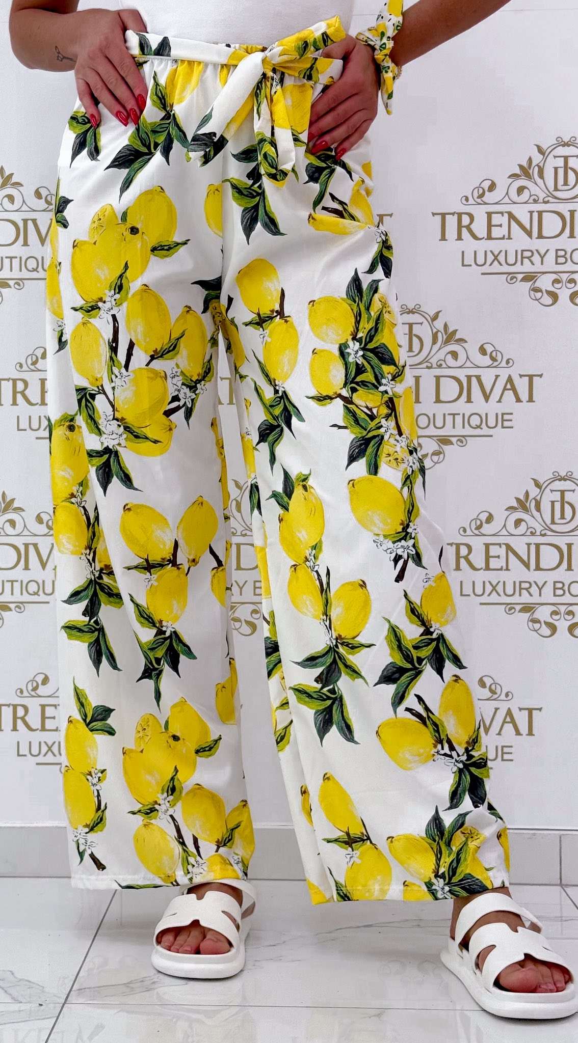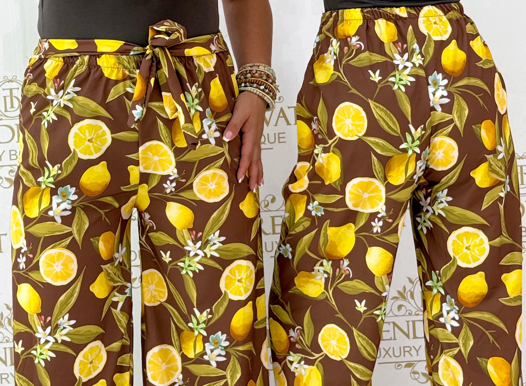 Masnira köthető gumis derekú, lenge anyagú, citrom mintázatú palazzo nadrág