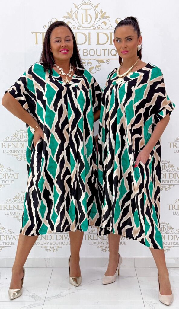 Ujjatlan, különleges mintázatú lenge vászon anyagú zsebes maxi ruha