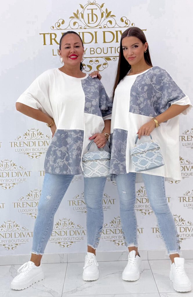 Álló galléros, lenge vászon anyagú, csíkos & virág mintázatú ing tunika